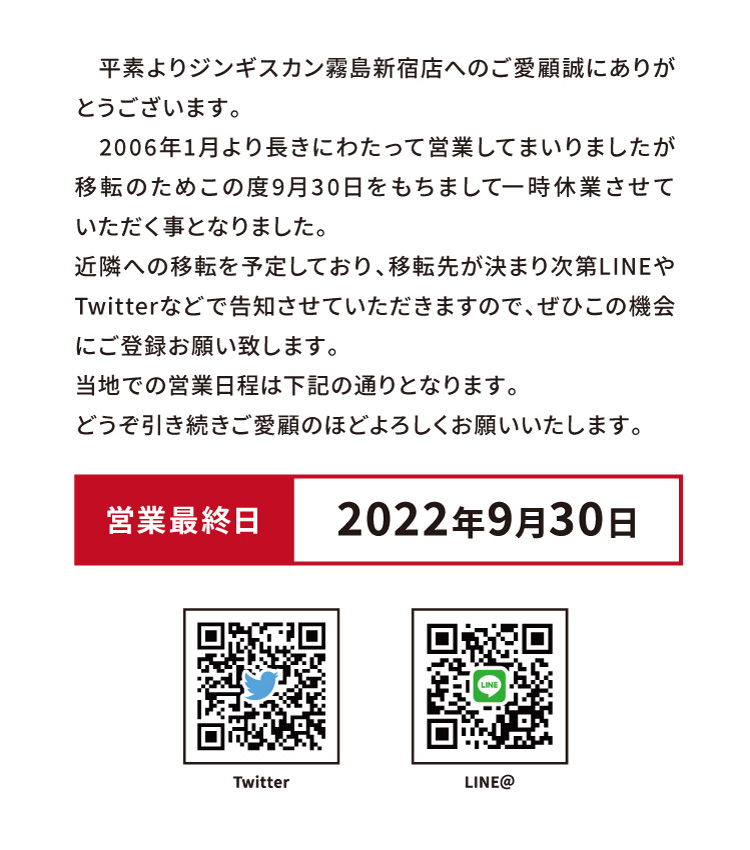 ジンギスカン霧島 新宿店 移転に伴う一時休業のお知らせ