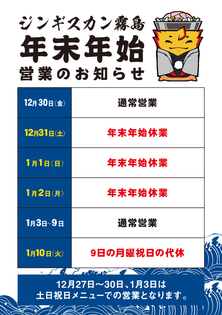 いつもご愛顧いただき誠にありがとうございます。 ジンギスカン霧島全店の年末年始の営業についてご案内いたします。 本年もたくさんのご愛顧を賜り誠にありがとうございました。 2023年も美味しいジンギスカンとサービスのさらなる向上に努めてまいります。 今後とも何卒よろしくお願い申し上げます。 営業日時等は政府及び都道府県の要請に応じて変更となる場合がございます。 変更があり次第こちらにてお知らせをさせていただきます。 2022年11月11日 更新